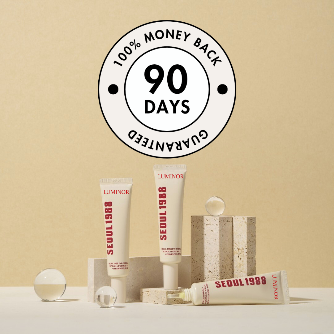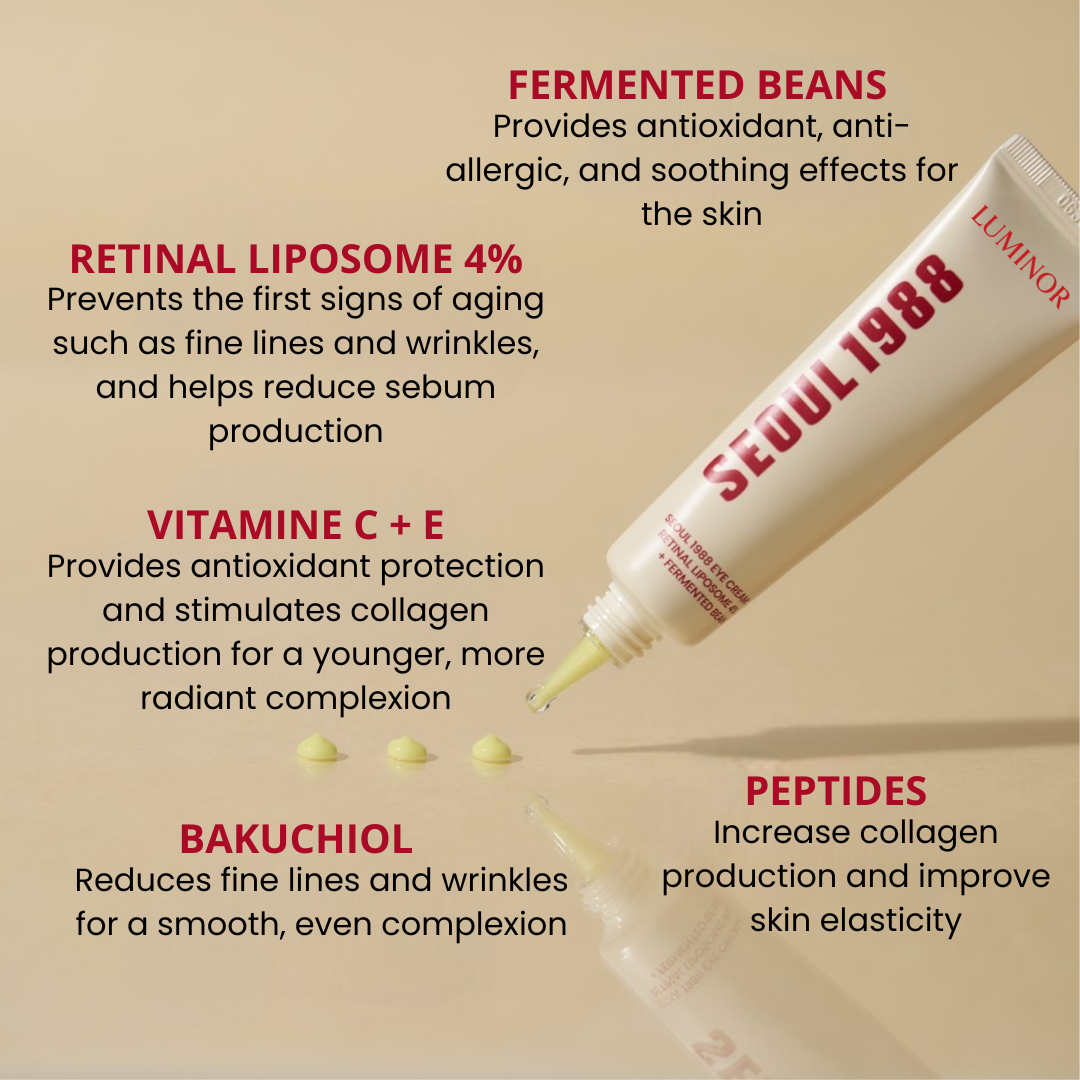 LUMINOR SEOUL 1988 Eye Cream is packed with 4% retinol liposomes, fermented bean extract, bakuchiol, peptides, and hyaluronic acid delivering powerful hydrating, brightening, and firming effects.